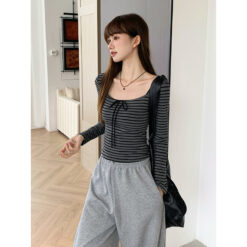 Spring frenum T-shirt stripe black-gray tops for women