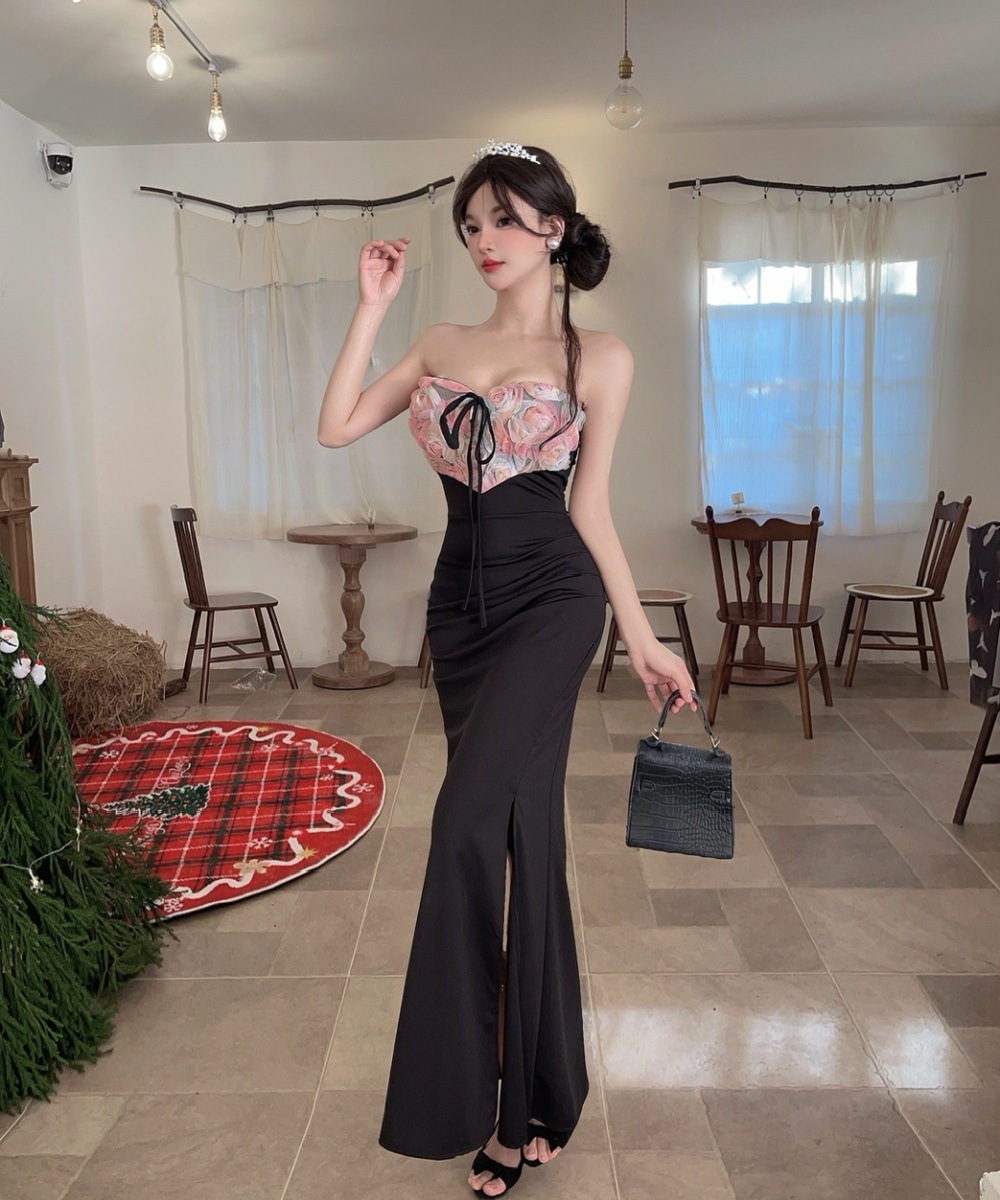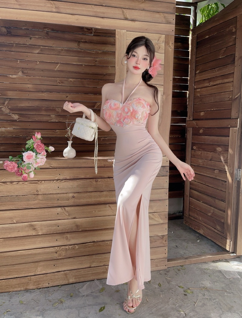 Low-cut sexy splice formal dress long high split flowers dress